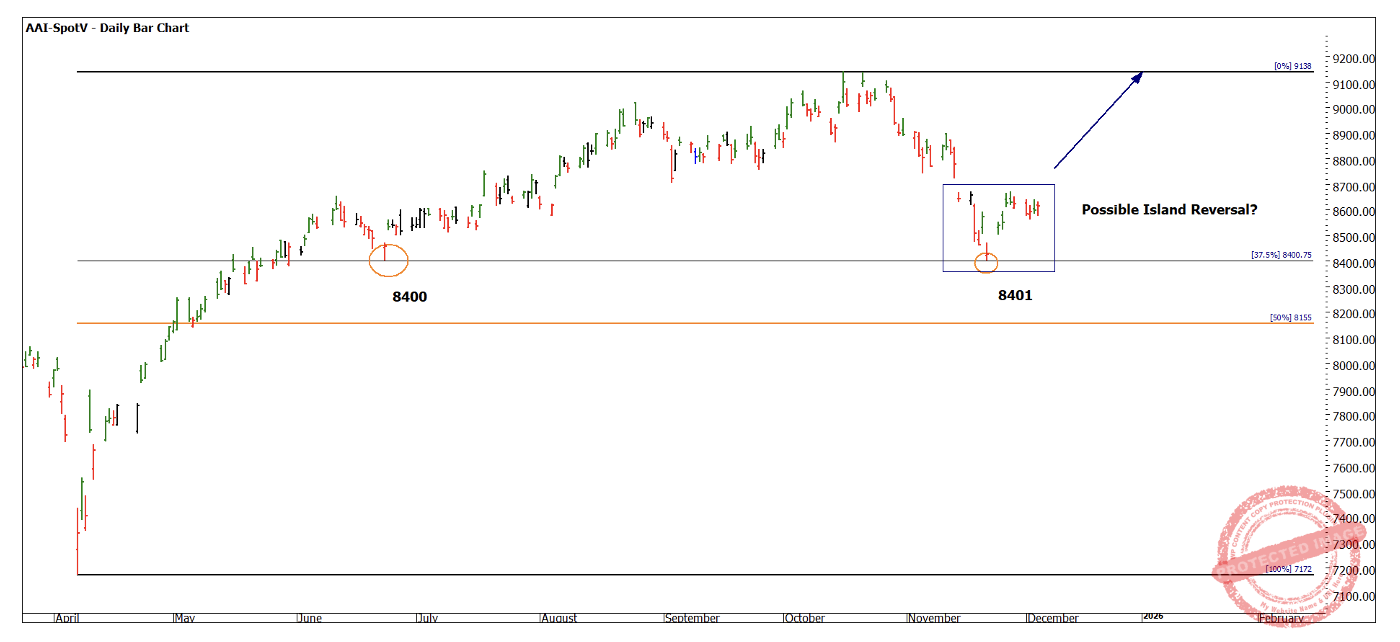 There is an area of support at 8400 that is supported by 2 lows. It also aligns with the 37.5% retracement level of the April – October Range.