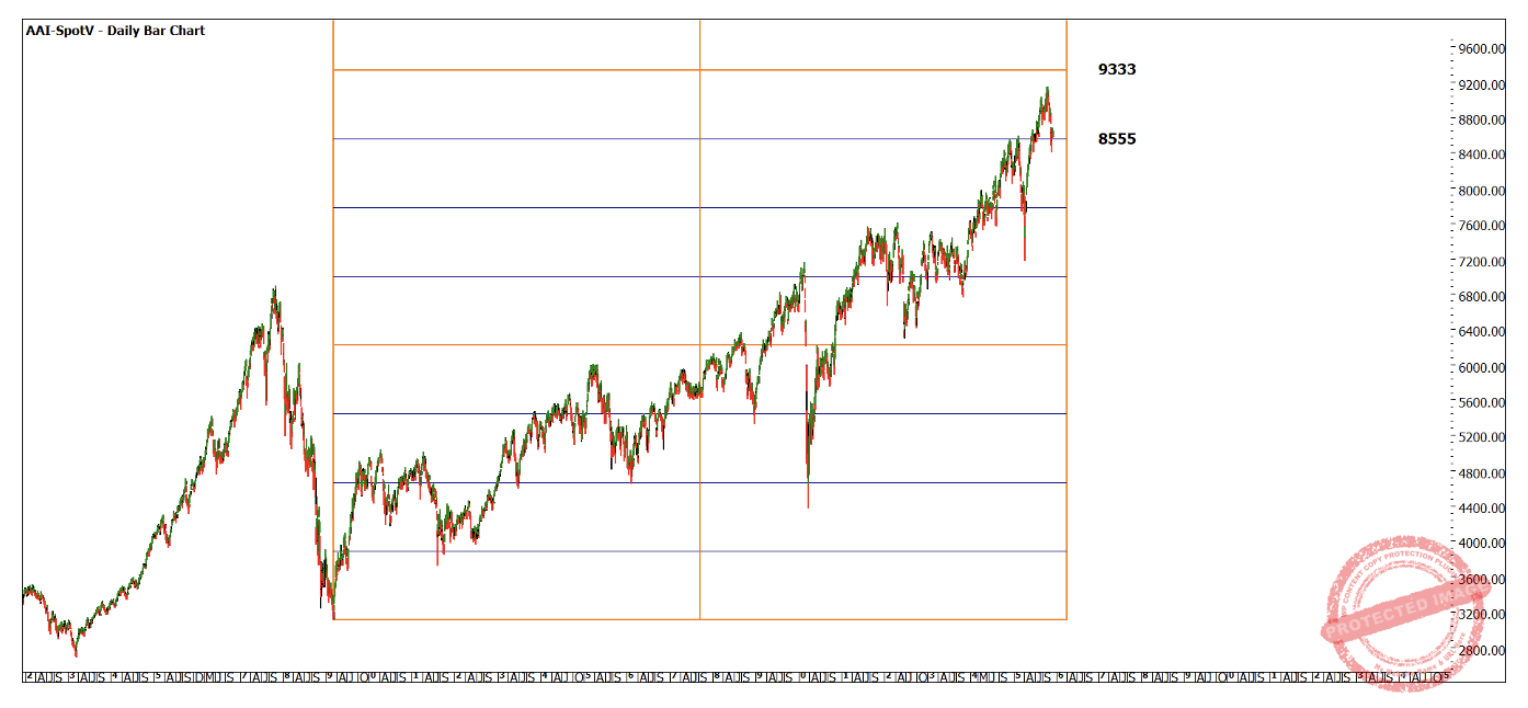 Of course, we like to see there being price support and clusters at the approximate level of the island reversal. Chart 3 uses the GFC low of 3111 and when we multiply that we see that 275% of 3111 gives us 8555. This is a good approximation of where old tops formed  and also where the support is currently formed. This technique is what called a Lows Resistance Card from your Number One Trading Plan.