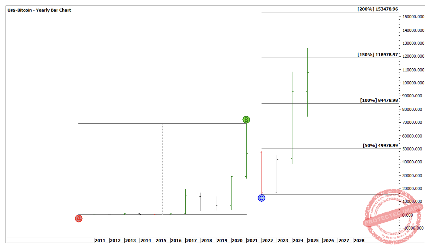 Two tops at the same level doesn’t automatically mean a short trade so to confirm this setup I want to take a look at the big picture. In Chart 2 below, you can see the yearly swing chart looks like it only has three swings in it. It actually has 5 swings however the early swings are so small in comparison there is no point including it in this bigger picture analysis. Nonetheless, the major range shows this market has hit 150% of the previous major range.