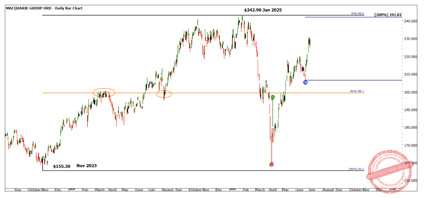 Other areas to note is that the 50% of the November 2023 and January 2025 top was important to the final high even before the top came in, this suggests to me this market has good market symmetry when it comes to our style of analysis. Final note for Chart 1 is that the First Range Out from the 7 April low, when added to the June 25 low at 100%, gives us a very close cluster to the January 2025 high @ $241.82.