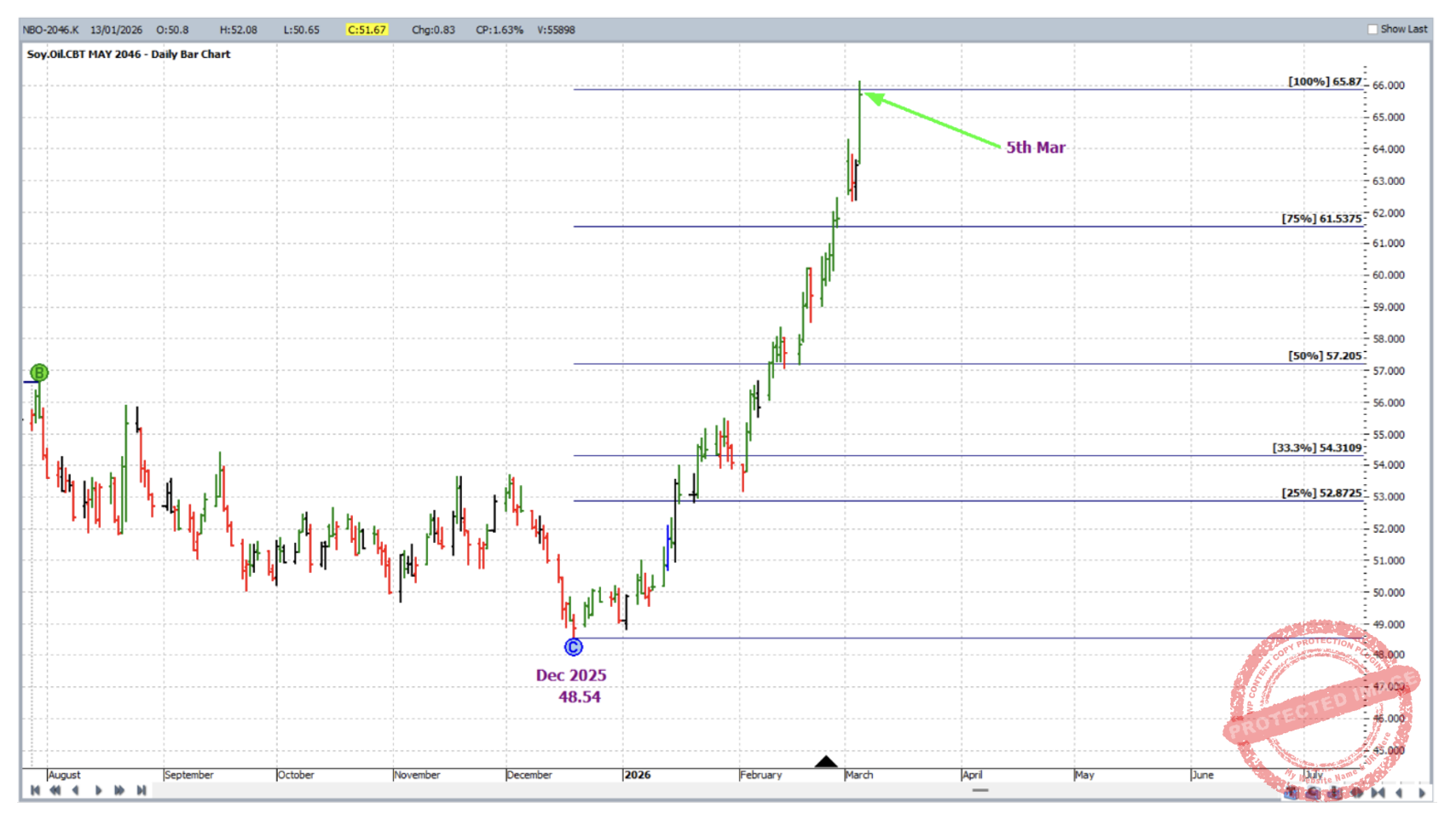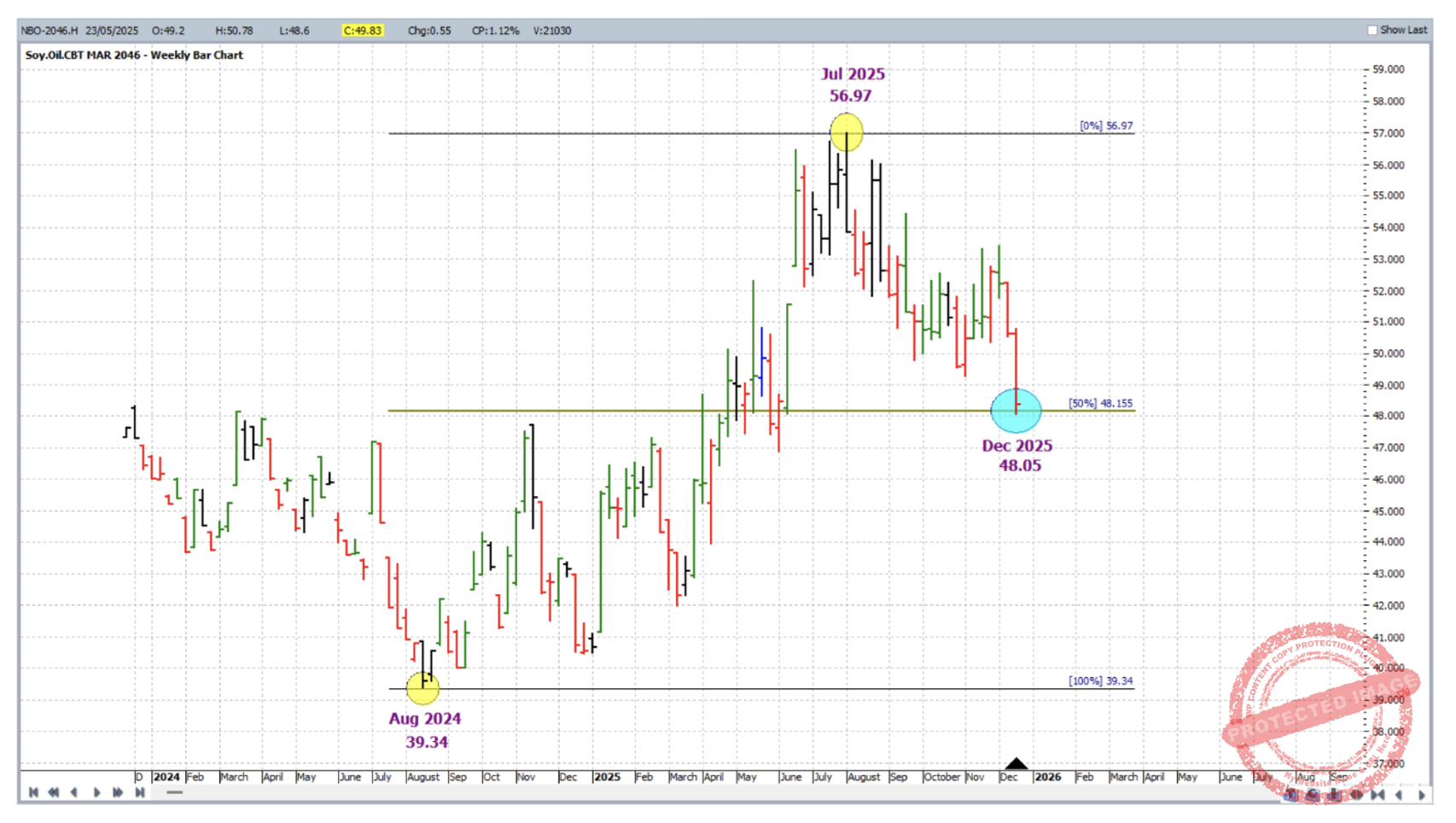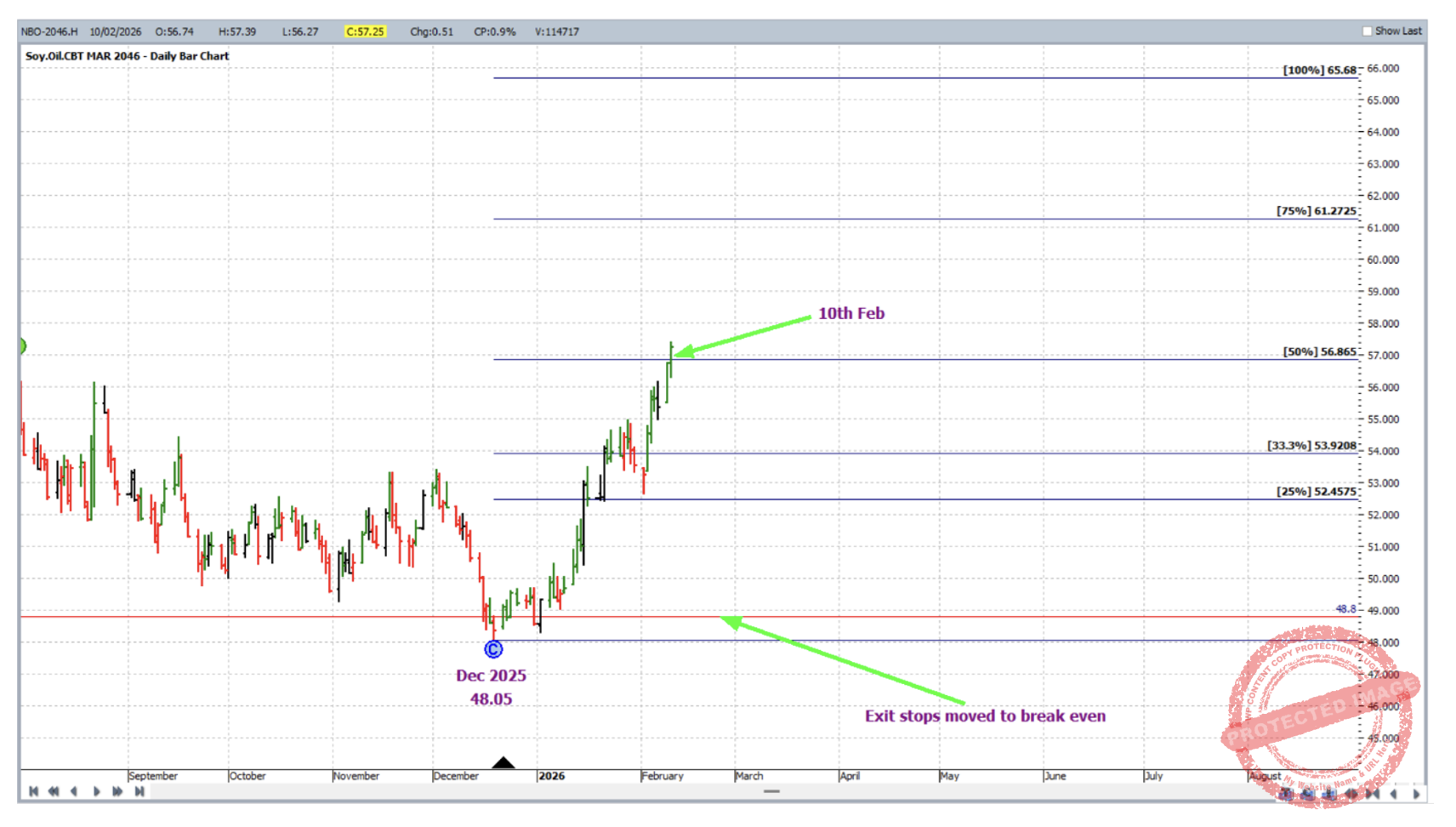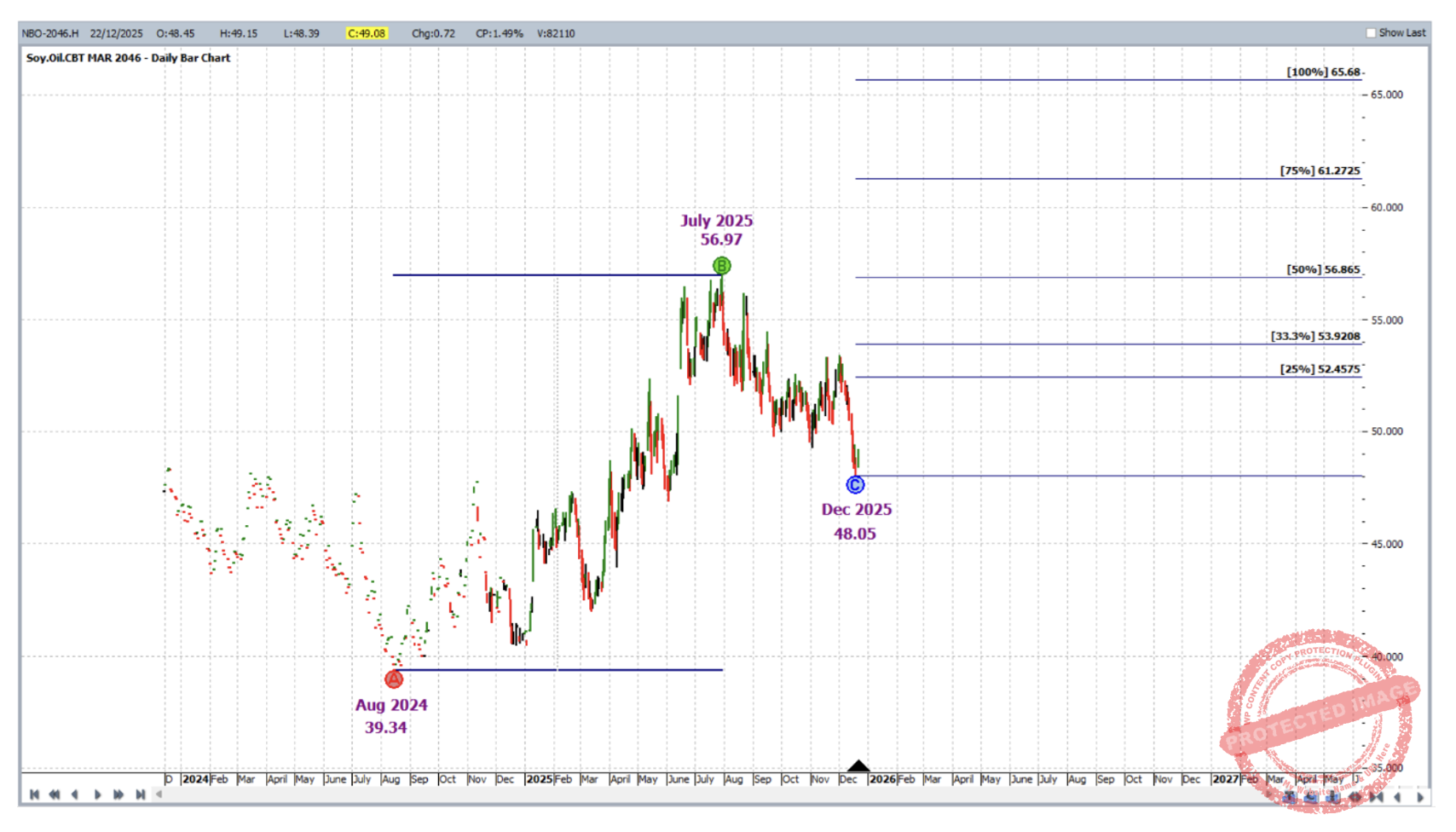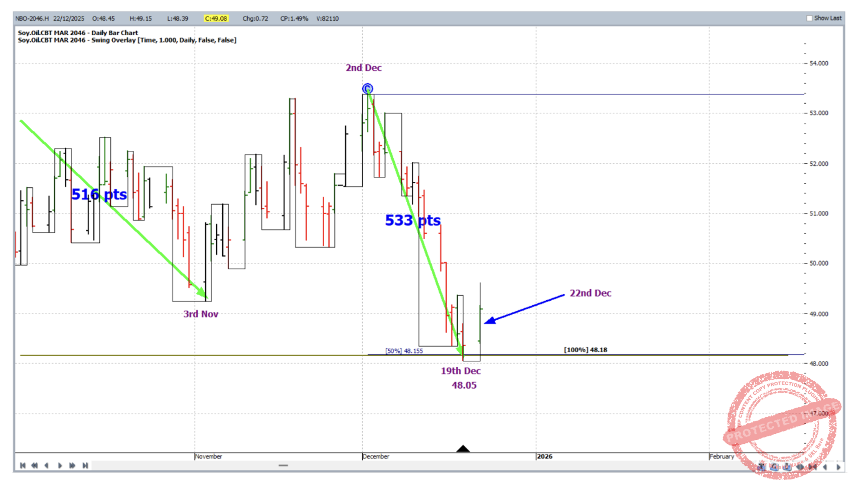 For a long trade entry, the up turning of the daily swing chart on 22 December 2025 had you long Bean Oil at 48.80 with initial exit stop loss at 48.04.