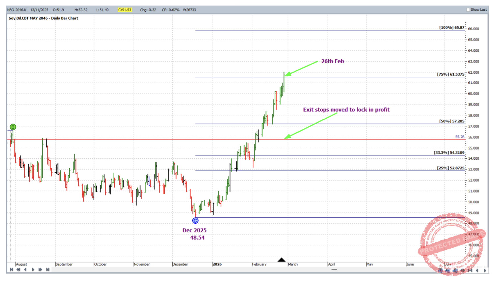 On 26 February 2026 the market reached the 75% milestone and exit stops were moved to roughly one third of the average monthly range (144 points on the May contract chart) behind the 50% milestone.