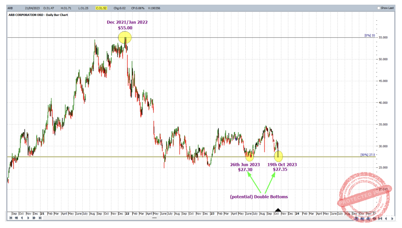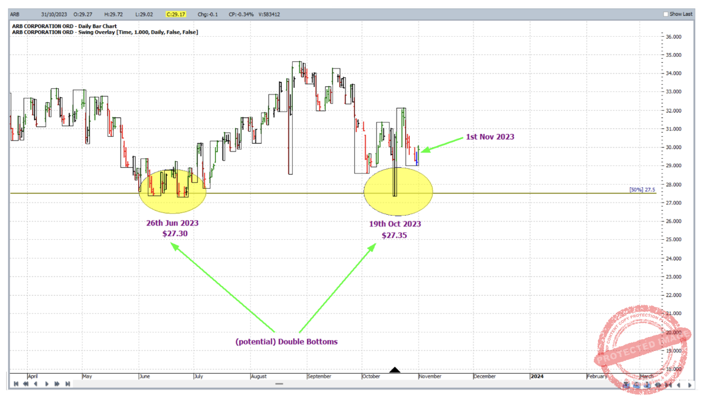 This month’s article brings together a few key elements from the Number One Trading Plan manual. We will observe the case study of a share CFD trade on Aussie top 200 constituent, ARB:ASX (ARB Corporation Limited) with the key parts of analysis prior to trade entry being Double Bottoms and the Highs Resistance Card. In terms of trade implementation the First Higher Swing Bottom entry signal is engaged and milestones are used to manage the trade as it progresses.