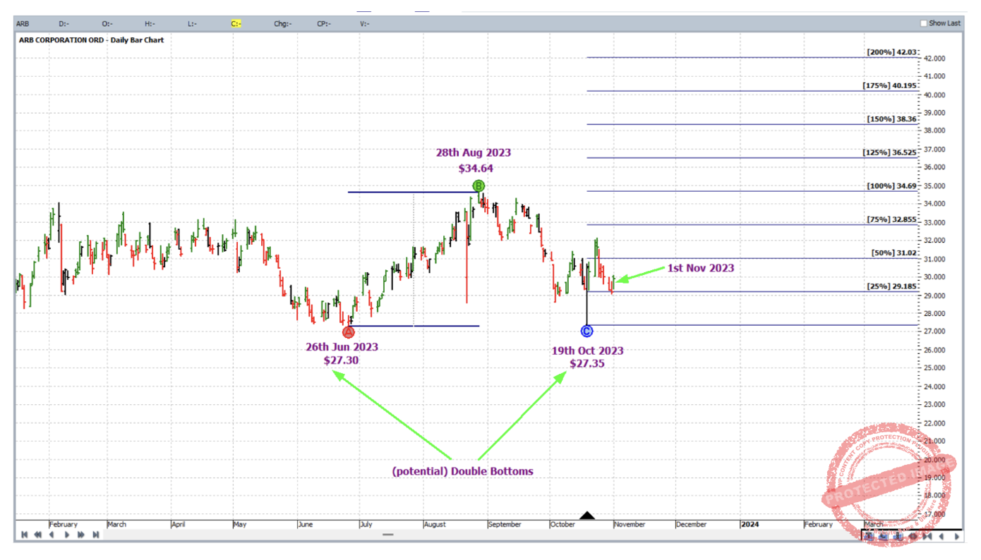 A screenshot of the analysis is shown below, with the ARB’s daily bar chart in Walk Thru mode, with data up to and including 19 October 2023 at a low of $27.35 – the second of two potential double bottoms, the first being 26 June 2023 at $27.30; and we note that both rested, within tolerable error, on the all-important 50% resistance level of the Highs Resistance Card applied to the All-Time High of $55.00 from late 2021/early 2022.