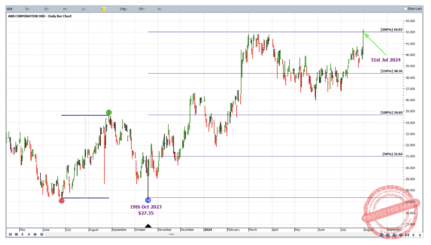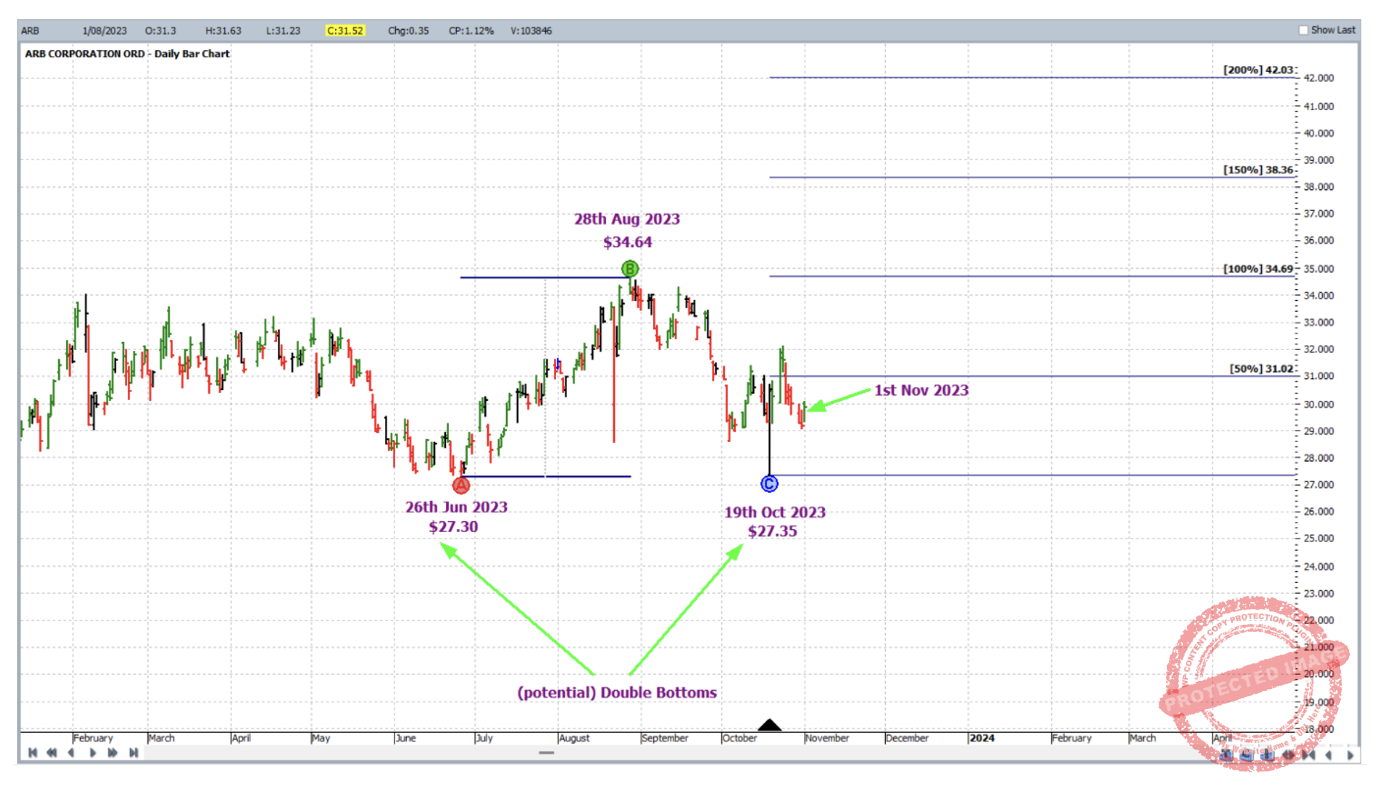 As for trade management, the AB reference range was that from the 26 June 2023 low ($27.30) to the 28 August 2023 high ($34.64) and Point C the second of the two double bottoms. And this being a double bottom formation, the 200% milestone is the exit target.