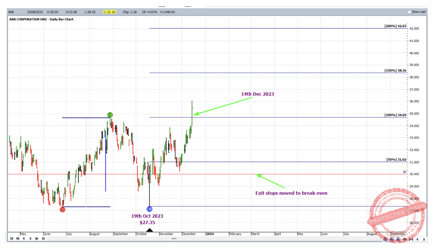 On 14 December 2023, the market broke through the 100% milestone and exit stops were moved to break even.