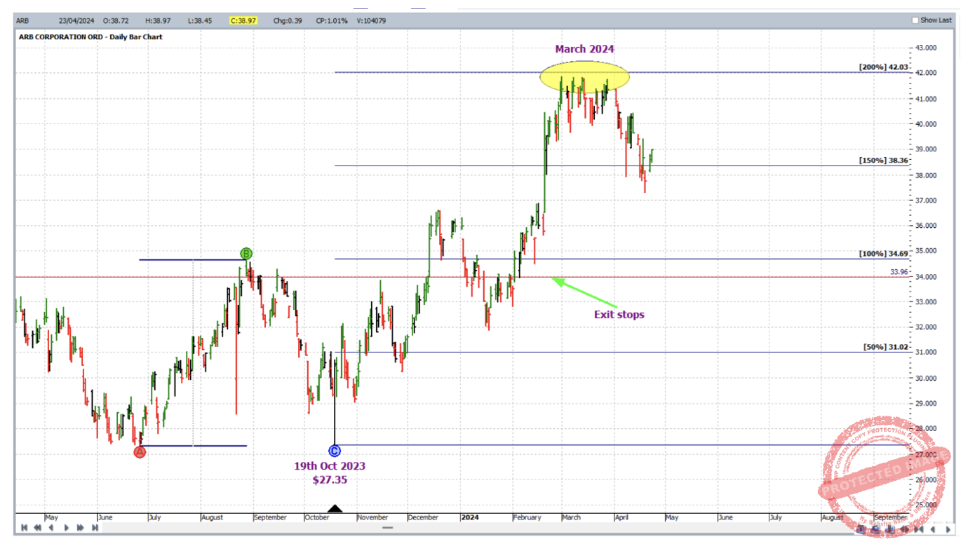 On 20 February 2024, the market broke through the 150% milestone and exit stops were moved to one-third of the average weekly range (approximately 73c at the time) below the 100% milestone, to lock in some profit.