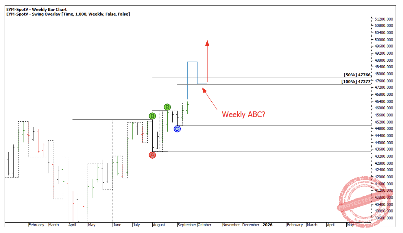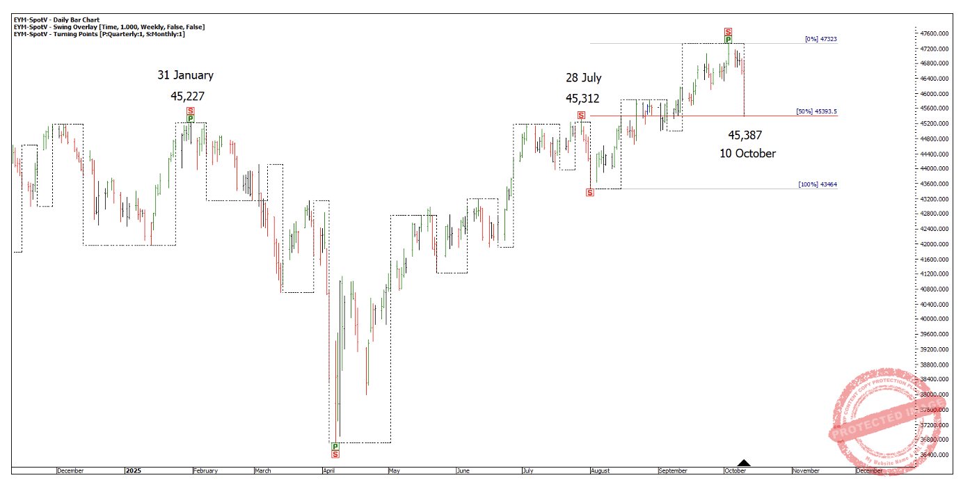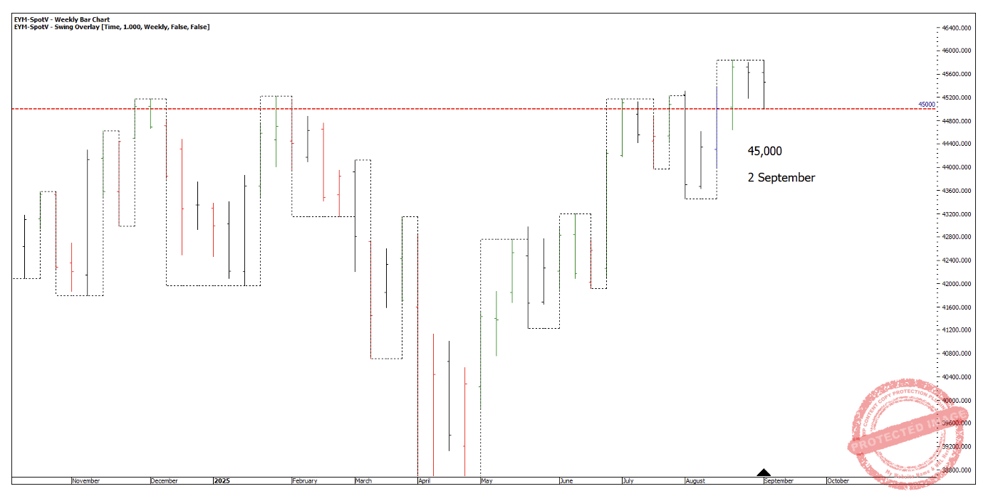 The 2 September weekly swing low at exactly 45,000 found support on old all-time highs. However, the weekly swing retracement was caused by an outside week and was only about 33%.