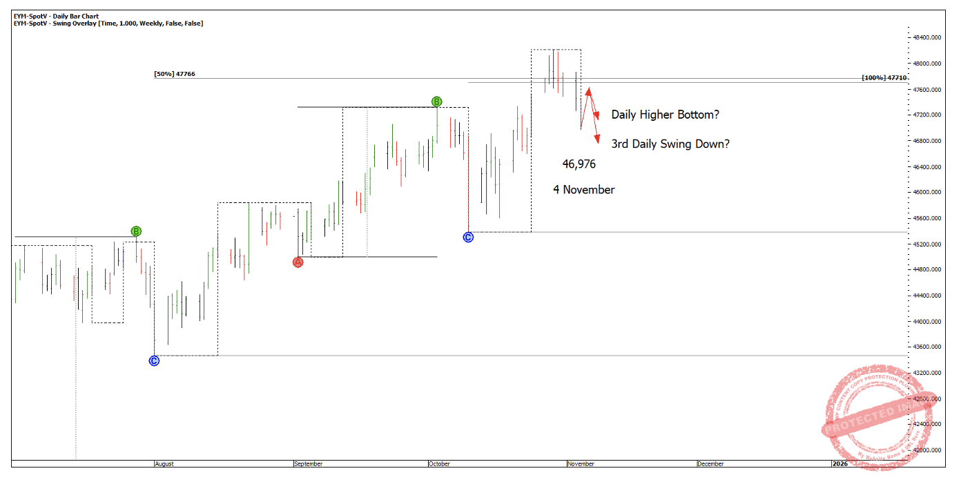 The Dow pushed higher only to find some resistance at the current price milestones and now shows a Point C low on 4 November at 46,976. For a stronger Point C, I would have liked to have seen Point B a bit higher so Point C could show a balanced 50% retracement on top of those milestones and finding them as clear support.