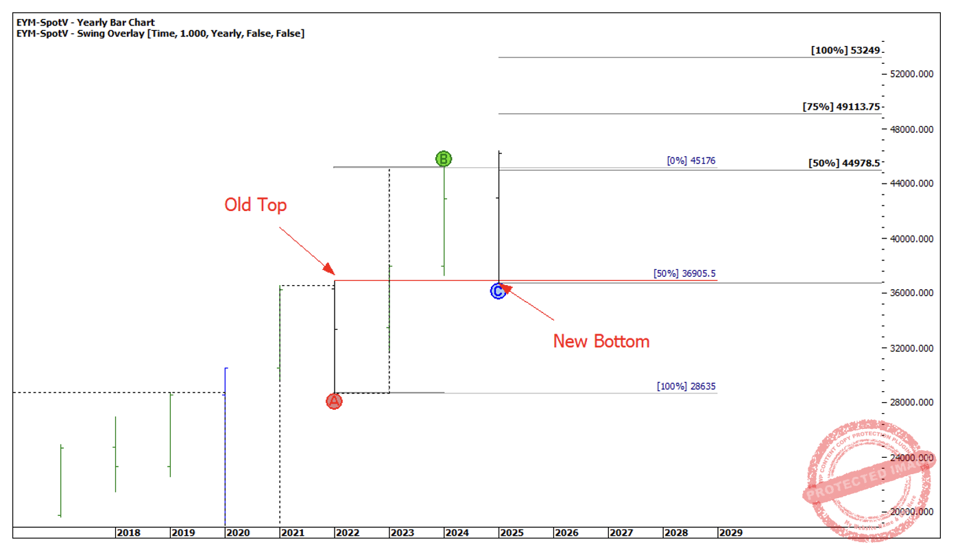 Now the weekly swing chart is showing the next major milestone to watch is 100% and a price of 47,377.