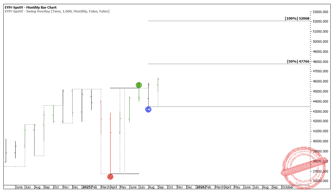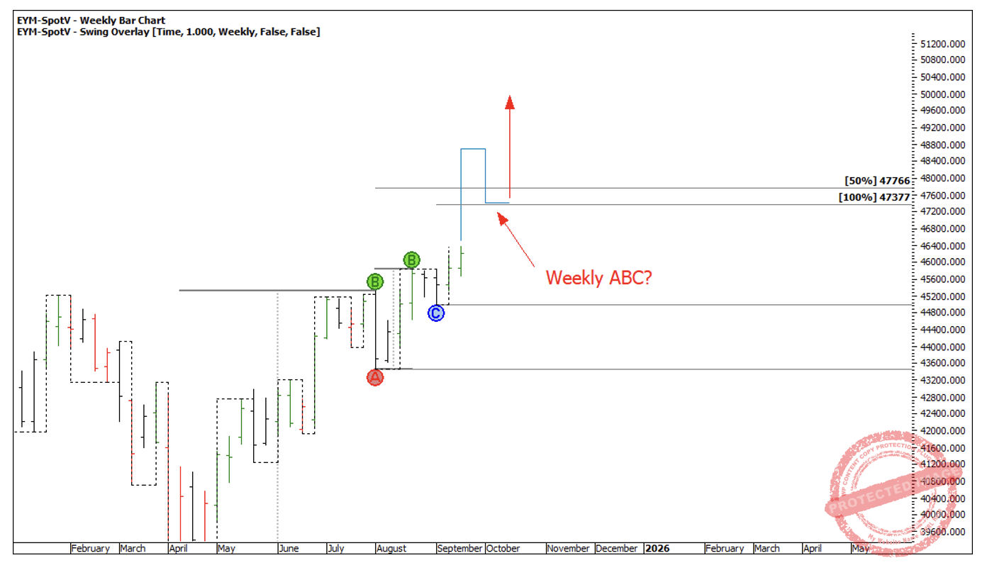 Dropping down to the monthly, it appears that the Dow is in its second section up. The 50% milestone shows a price of 47,766 which doesn’t cluster with anything else at this stage.